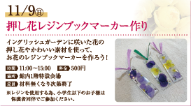 | 2025.11.09日 11:00~15:00 | 11/9(日)「押し花レジンブックマーカー作り」 イングリッシュガーデンに咲いた花の押し花やかわいい素材を使って、お花のレジンブックマーカーを作ろう! |   |
