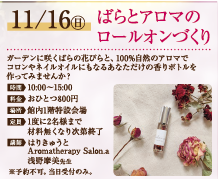 | 2025.11.16日 10:00~15:00 | 11-16(日)「ばらとアロマのロールオンづくり」【先着順】 ガーデンに咲くばらの花びらと、100%自然のアロマで、コロンやネイルオイルにもなるあなただけの香りボトルを作ってみませんか? |   |