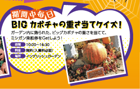 ガーデン内に飾られた、「BIGカボチャ」の重さを当てて、ミシガン乗船券をGetしよう! 開催時間:期間中毎日 10:00~16:30 参加費:無料(ガーデン入園料は別途必要) |