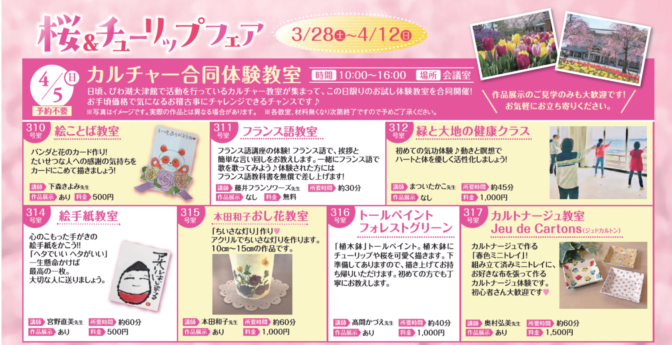 びわ湖大津館で活動を行っているカルチャー教室が集まって、この日限りのお試し体験教室を合同開催!気になるお稽古事にチャレンジできるチャンスです♪